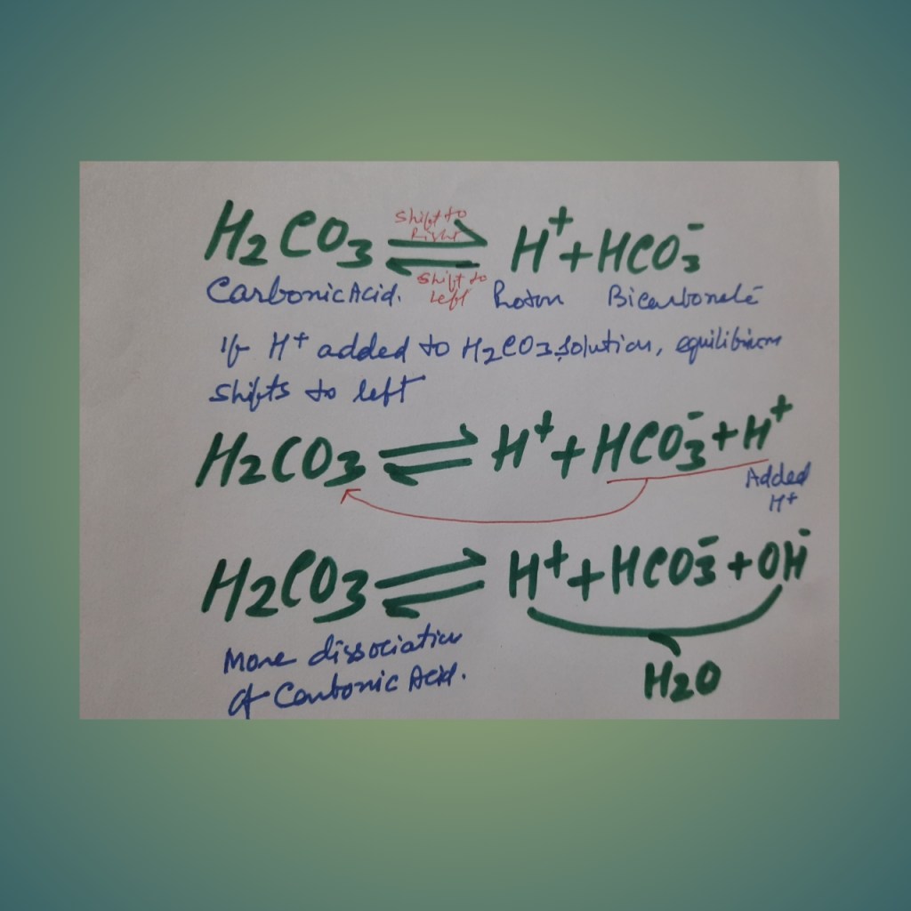 If a powerful acid is added to the solution with the bicarbonate buffer system, more hydrogen ions are added, then the equilibrium shifts to the left. Most of the added hydrogen is removed from the solution maintaining the Ph.